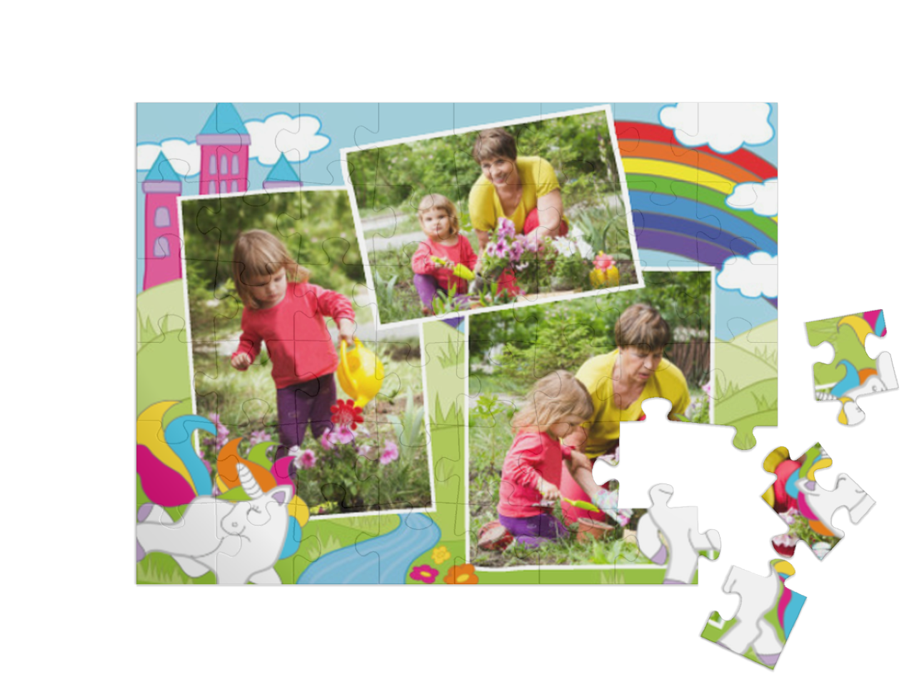 Einhorn-Kinderpuzzle: „Regenbogenland“ in Querformat Collage