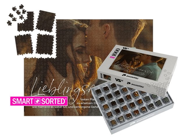 Ein Erinnerungsstück, zusammengesetzt von der ganzen Hochzeitsgesellschaft – genau das erhältst du mit einem SMART SORTED Puzzle. Die Aufgabe ist klar – während der Feier gemeinsam ein 1000-Teile Puzzle fertigstellen. Und dank SMART SORTED wird das zu einem richtigen Highlight. Das Puzzle ist bereits vorsortiert – in 40 Boxen á 25 Teile. So können die Gäste miteinander oder auch gegeneinander puzzeln und spielerisch ein hübsches Andenken an einen ganz besonderen Tag schaffen. Es ist nicht nur das Bild in einem schönen Rahmen, das man bekommt, sondern viel mehr der Gedanke, wie viele Hände gemeinsam daran gearbeitet haben und wie viele Menschen gemeinsam die Liebe gefeiert haben. Auch für die kleinen Gäste eignet sich SMART SORTED perfekt.