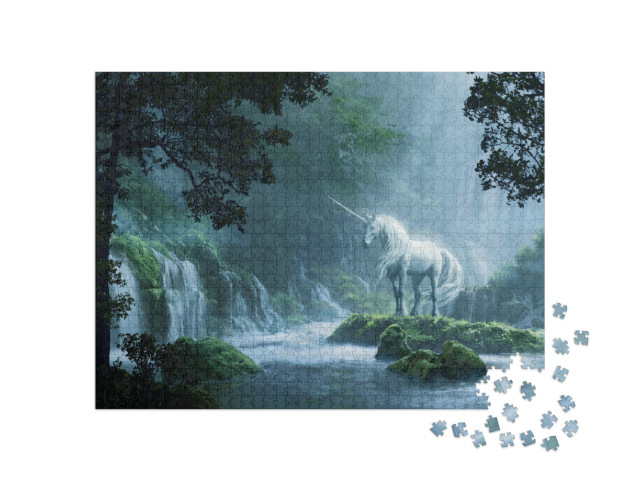 Puzzle „Ein schönes Einhorn in einem magischen Wald, digitale Illustration“