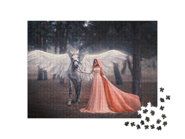Puzzle „Künstlerische Fotografie: Junge Elfenfrau mit ihrem geflügelten Einhorn“