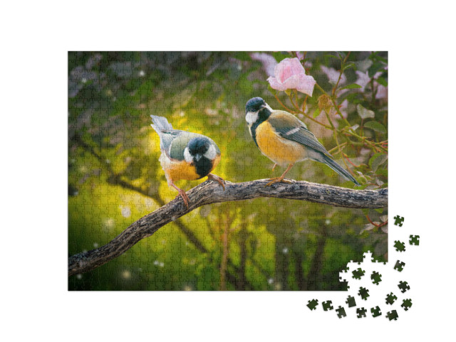 Puzzle „Fantasy-Porträt: Zwei Kohlmeisen im Märchenwald“