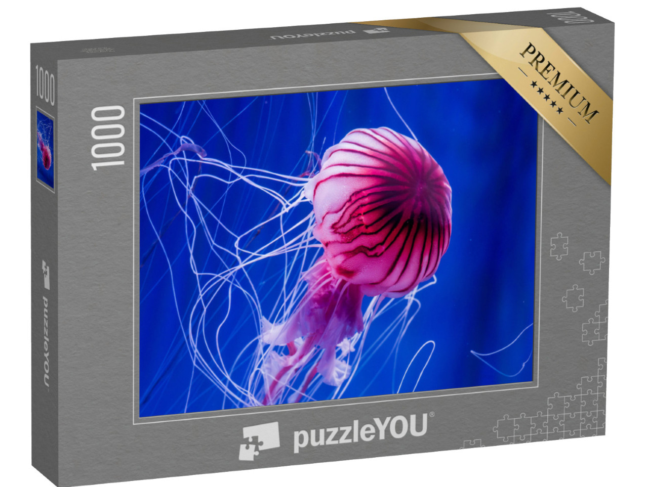 Puzzle „Rosafarbene Qualle vor einem blauen Meereshintergrund, Nahaufnahme“