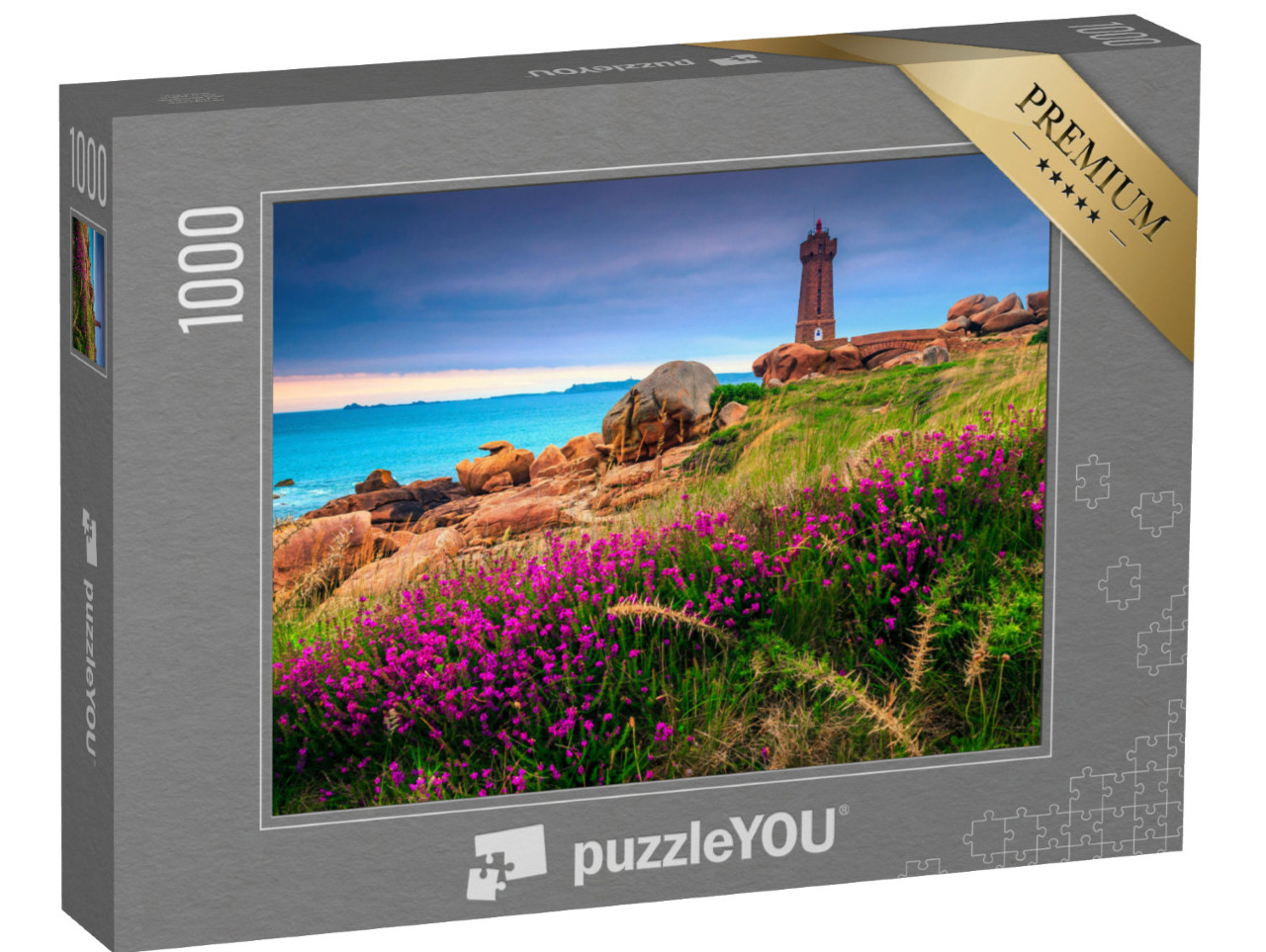Puzzle „Leuchtturm und Blumen im Sonnenuntergang, Bretagne, Frankreich“