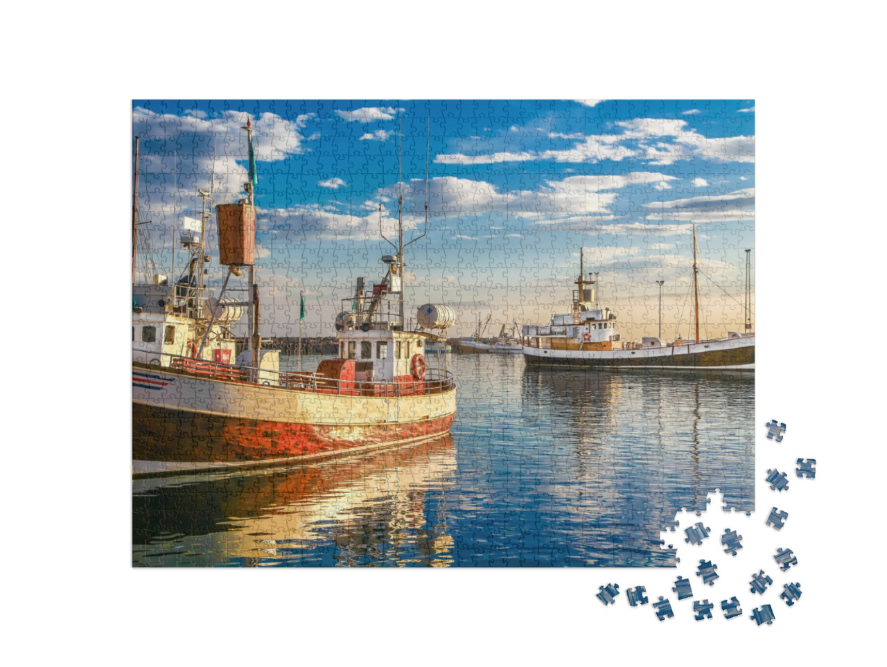 Puzzle „Fischerboote im Hafen bei Sonnenuntergang, Stadt Husavik, Island“
