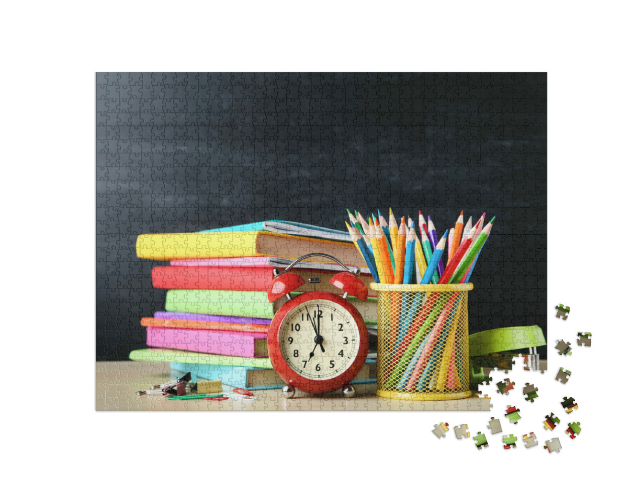 Puzzle „Schulbücher mit Bleistiften und Wecker“