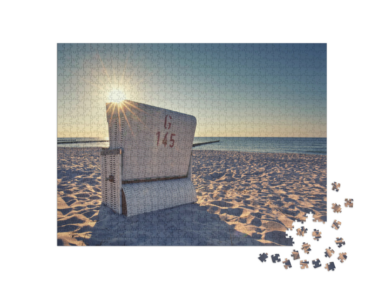 Puzzle „Sonnenuntergang am Ostseestrand, Strandkorb im weißen Sand stehend“