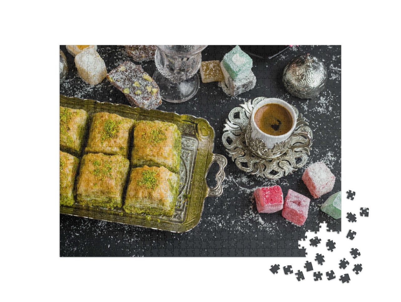 Puzzle „Baklava mit Pistazien, ein traditionelles türkisches Gebäck mit Kaffee“