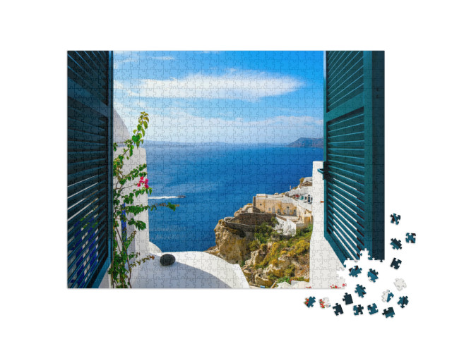 Puzzle „Blick aus einem Fenster im Dorf Oia auf der Insel Santorin, Griechenland“