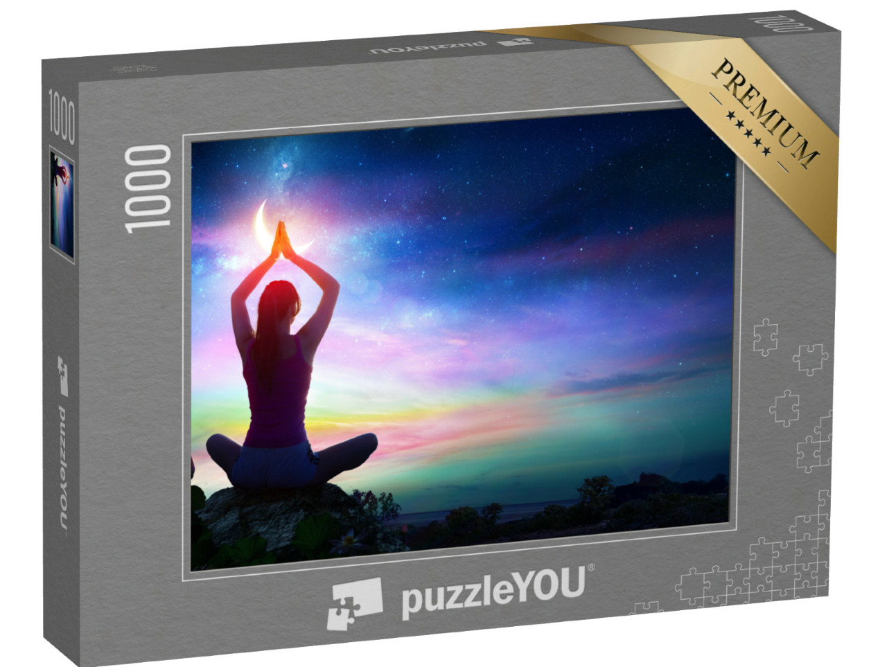 Puzzle „Frau beim Yoga mit Lotusblumen und Chakra-Farbverlauf“