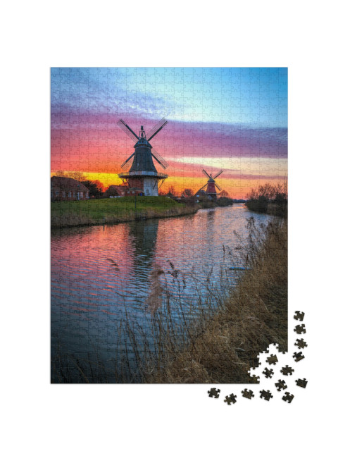 Puzzle „Zwillingsmühlen von Greetsiel, Ostfriesland bei Sonnenaufgang“