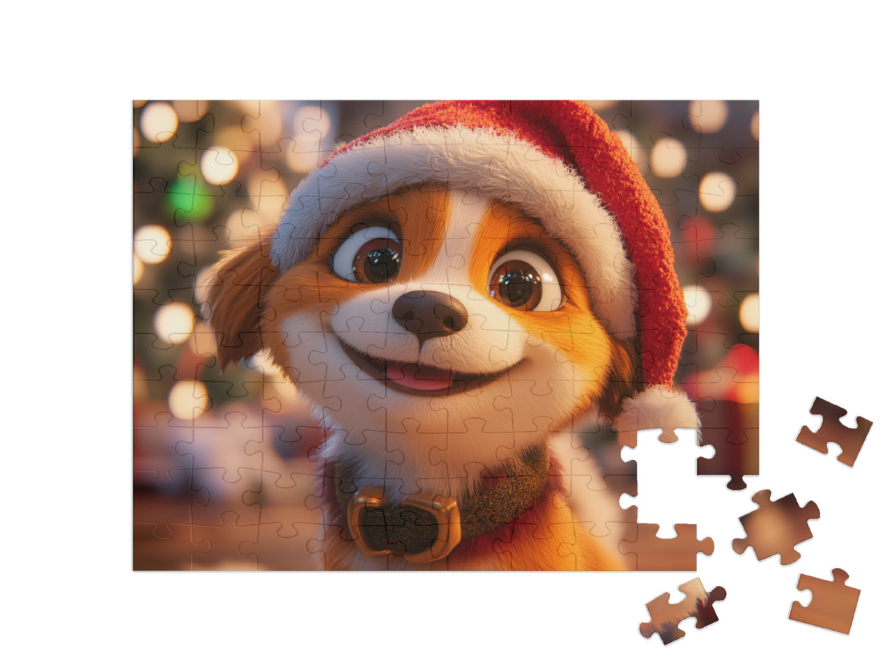 Puzzle „Der kleine Hundewelpe mit Weihnachtsmütze“